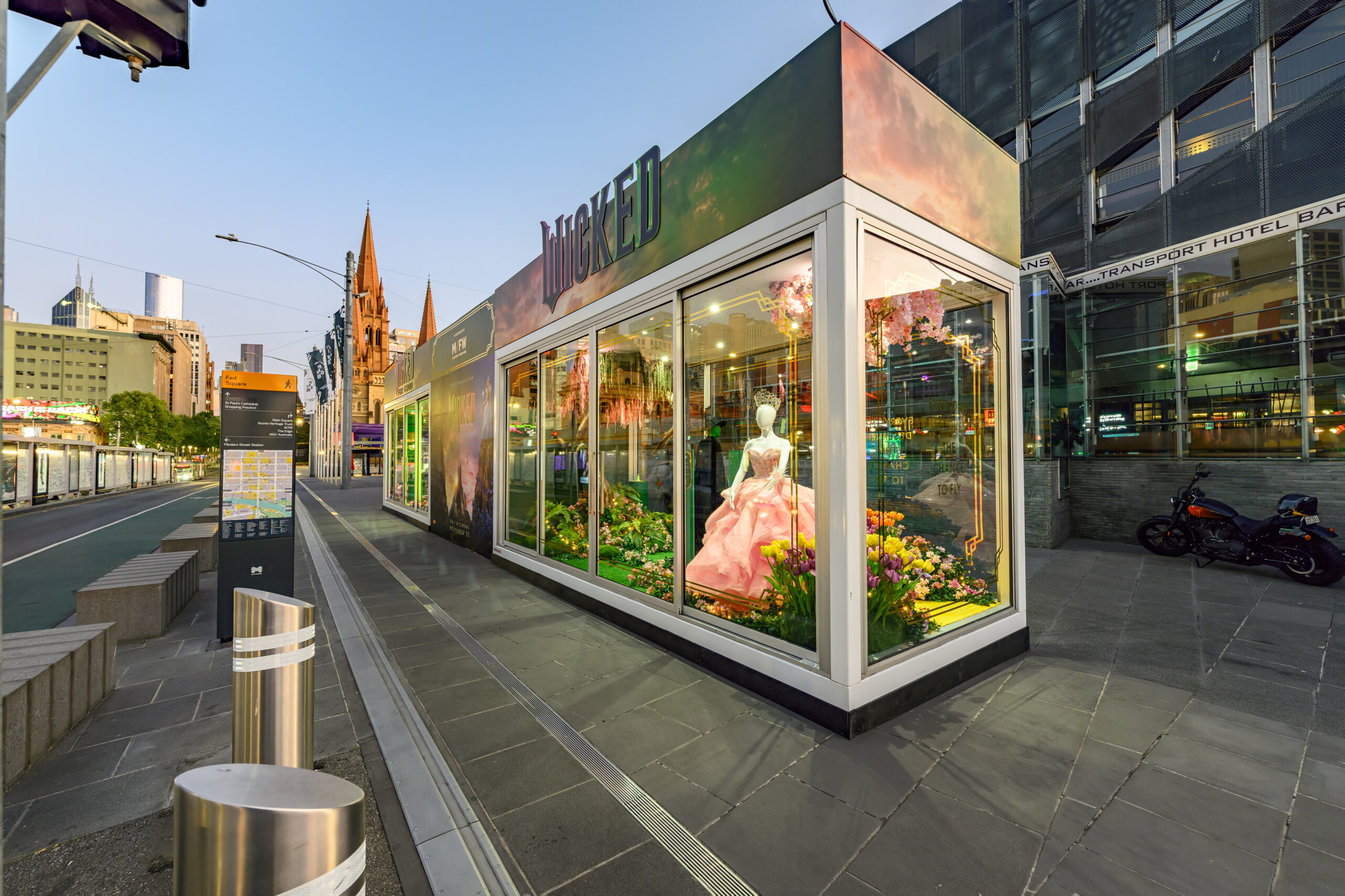 A little wicked magic in the heart of Fed Square, Melbourne City. The finishing touches on this incredible installation for Melbourne Fashion Week’s ‘Wicked Wardrobe Exhibition’ are nothing short of spectacular! Well done Moth Design and thank you for choosing SPACECUBE to exhibit this stunning display (rain or shine!) featuring costumes direct from the set of Wicked and Wicked for Good.